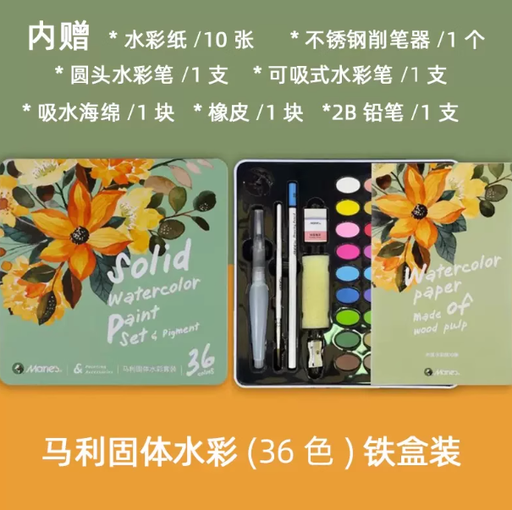 Marie's Solid Watercolor Paint Set & Pigment - 36 Colors 马利固体水彩套装铁盒装 36色
