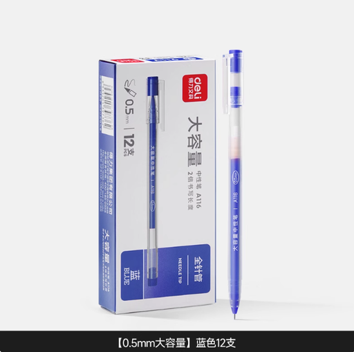 DELI High Capacity Gel Ink Pen - 0.5mm Blue Ink 12pcs 得力大容量中性笔0.5mm蓝色墨水12支